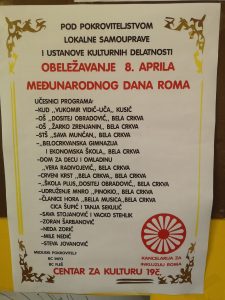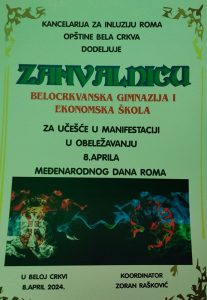 Вечерас, 8.Април 2024. је у Центру за културу Бела Црква обележен Међународни дан Рома. Ученици Белоцркванске гимназије и економске школе су вечерас говорили о знаменитим припадницима Ромске националне мањине, који су дали допринос образовању и култури ромског народа, али и култури и образовању уопште.